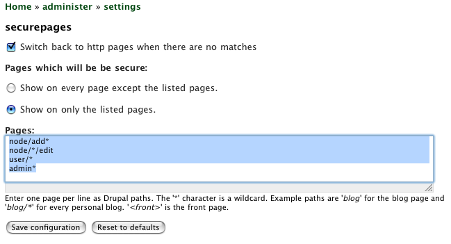 This part works kind of like block visibility. There is also a checkbox to switch back to http when a match from the list above is not made. I am very pleased with how this works and will switch my sites over to use this as opposed to the settings.php code changes I mentioned. I really like the way this is setup. Great job Gordon! I did notice that since admin* was already in the default list, my first test on a localhost drupal site was problematic since I didn't have ssl setup there and I couldn't get back into admin to turn off securesites. I then tested on a server with ssl and it worked perfect.