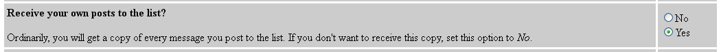 Hi Am I the only one who doesn't receive its own posts but has checked the option in the list manager like this to receive them ? (to be sure I did : check "No" => Submit my changes, check "Yes" again => Submit ..)