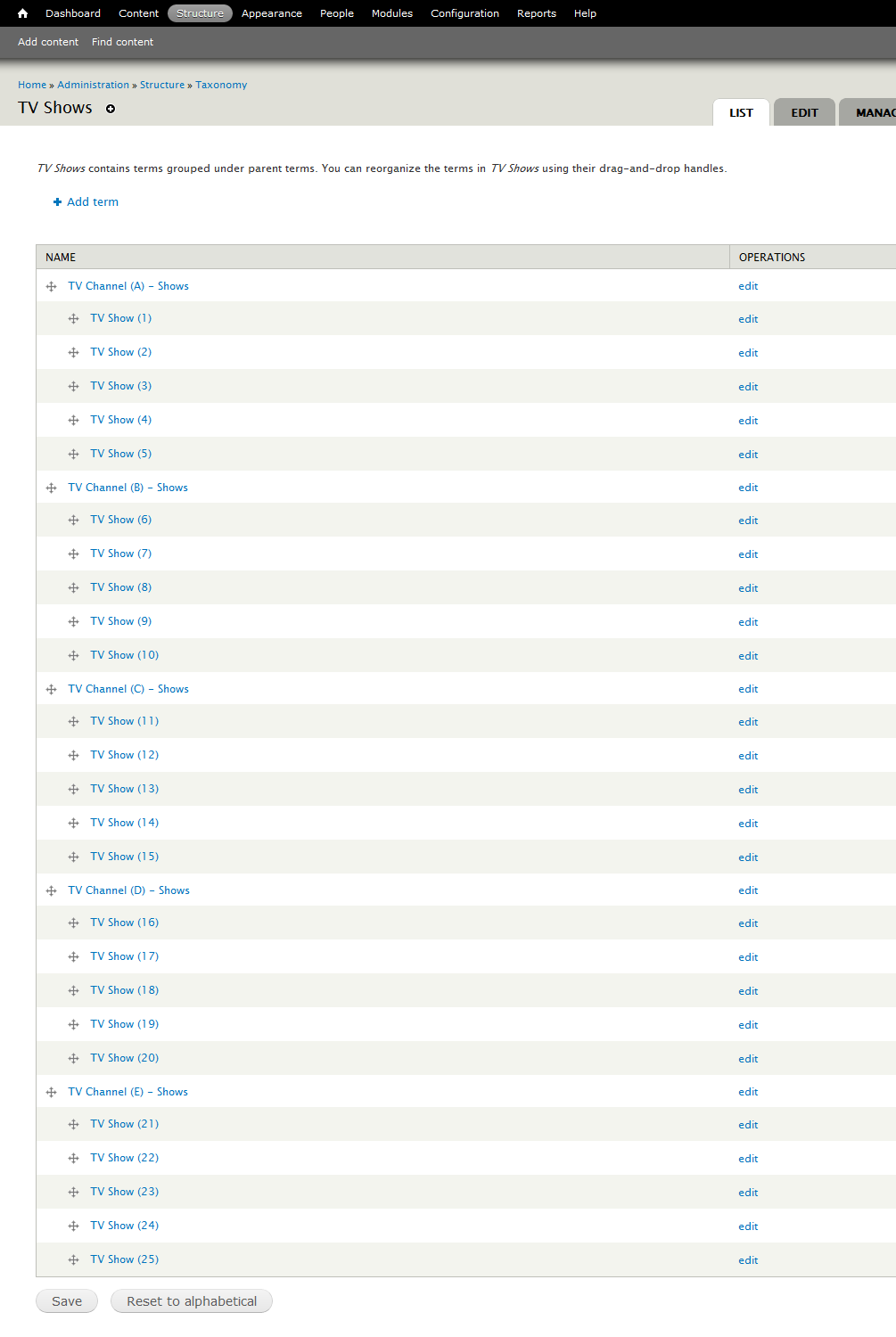For TV Shows I added about 15:20 terms for each TV Channel, like the following: - Channel 1 (main parent) -- TV Show a (child) -- TV Show b (child) -- ...etc