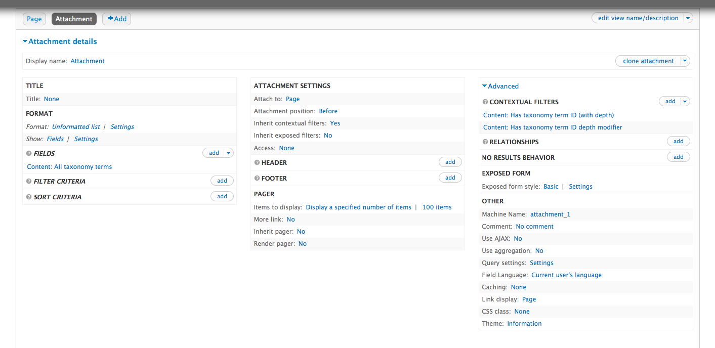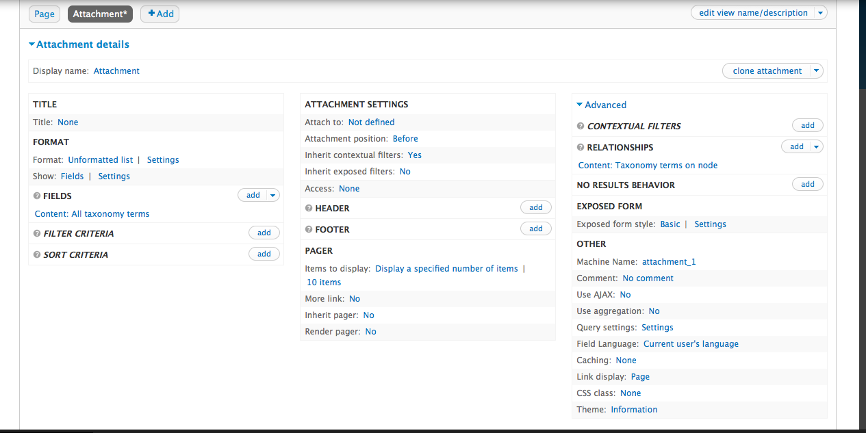 *The menu/Attachment I would use Fields (Under Show: Content (change this to fields)). The field would be Taxonomy term. I'd turn off the auto-link-to-term-page, turn on the custom link, link to /taxonomy/[term] (or whatever Views lists on replacement patterns). Format would be Unformatted list. Then you can style the View to be menu style using CSS. If that doesn't work, you could create a View of the Taxonomy Vocabulary, then show all Terms, in the Field Settings, you can make them Inline with a separator. That would limit it to only one Vocabulary, though.*