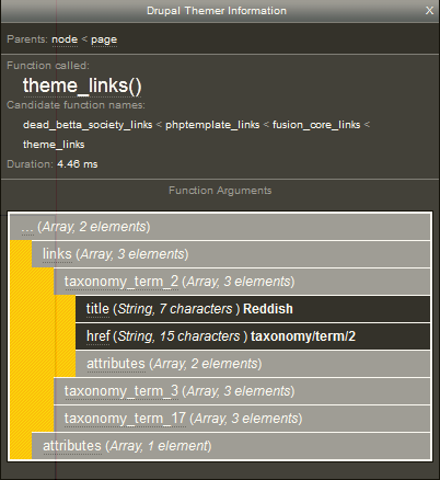 I can't figure out how to print one of the Taxonomy term links so it is hyper and not just a string of text. I can get the string of text printed by using: <?php print $node->taxonomy[2]->name; ?> View attachment "01Capture.PNG" to see how I got the information via dev module. Using the Themer Module and clicking one of the Taxonomy term links produces different information. See attachment "02Capture.PNG" for the different information. With the different information I cannot figure out how to print just one of the selected hyperlinks. Can someone help me out with the correct information on how to print the Taxonomy term hyperlinks? Thank you! -- http://about.me/elijahosborne _______________________________________________ themes mailing list themes@drupal.org <mailto:themes@drupal.org> http://lists.drupal.org/mailman/listinfo/themes